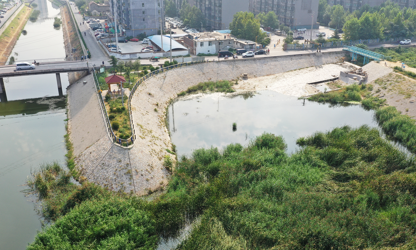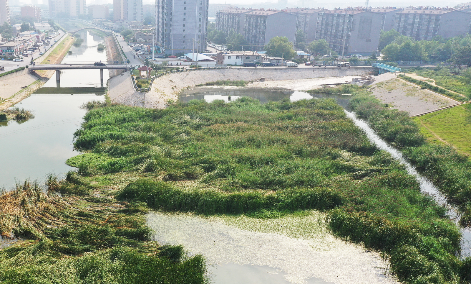 該項目于大澗溝匯入處構建人工-自然復合濕地,污水處理廠尾水經過濕地凈化后,水質由一級A標準提升至地表五類以上,滿足河道功能區水質要求,解決河道非汛期缺水問題,實現非常規水資源的安全、高效利用。 與普通濕地不同,該濕地將功能維護和強化作為重點,利用土著微生物技術對其進行長期維護,以保障其功能的可持續性,防止因來水不穩定、堵塞等因素導致濕地功能部分喪失,從而保證濕地健康可持續性運行。